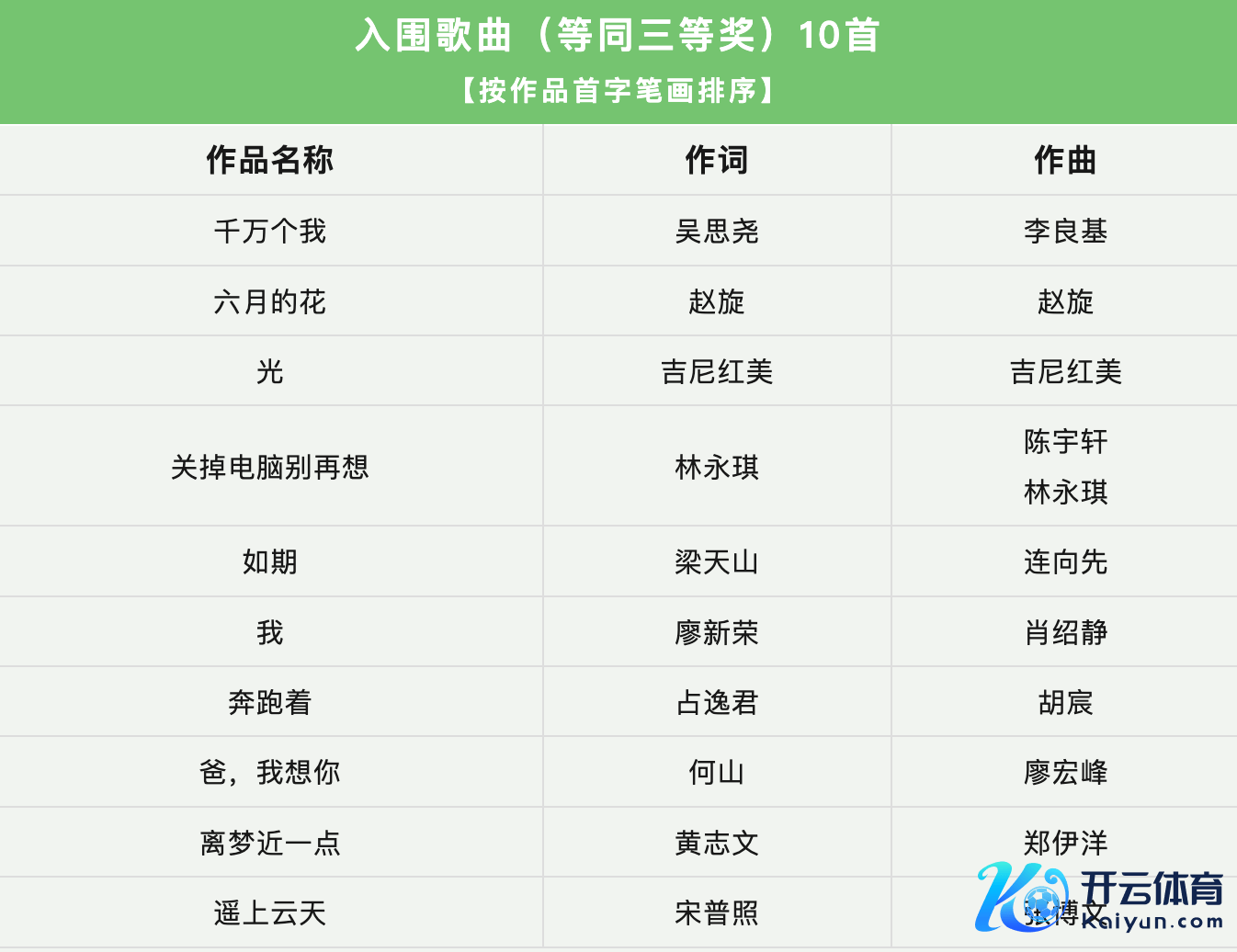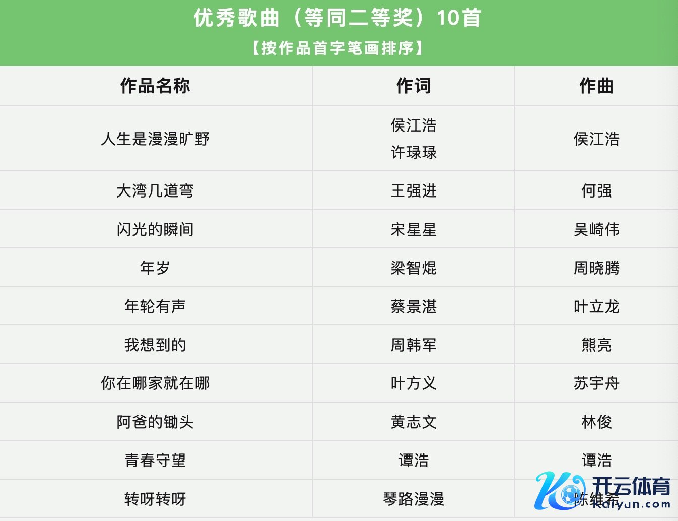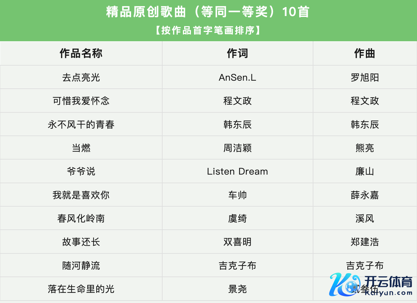 据了解,本次活动共收到投稿作品19743首。摆布单元组织群众对作品进行了自制、公正、专科、严谨的评审,评比出活动设定的各种奖项并向社会公示后,慎重公布30首获奖作品名单。获奖名单包括10首佳构原创歌曲(等兼并等奖)、10首优秀歌曲(等同二等奖)、10首入围歌曲(等同三等奖)。