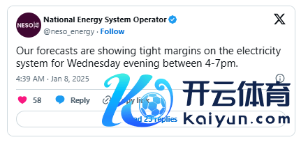 英国电网运营商发布了一份电力阛阓教化,称由于气温骤降,风力发电量下跌,瞻望周三供需之间将出现缓冲不及。